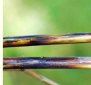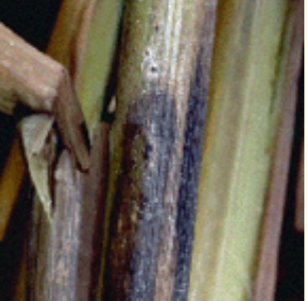 Yellowing of the stem, followed by softening of the stem tissues with fungal fructifications of the pathogen in the affected tissues.