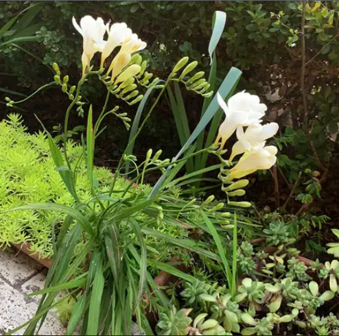 Freesia (Freesia) is a perennial that grows 1-2 ft tall, hardy in USDA Zones 9-10, prefers well-drained, loamy soil, full sun to part shade, medium moisture, and has no edible or medicinal uses.