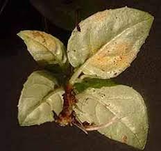 Orange or brown pustules on leaves Gray, fuzzy mold on leaves and flowers Yellowing leaves, sticky residue on leaves Yellowing leaves, stunted growth Wilting, yellowing leaves, root discoloration