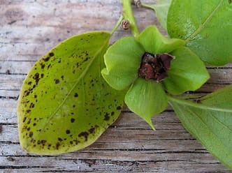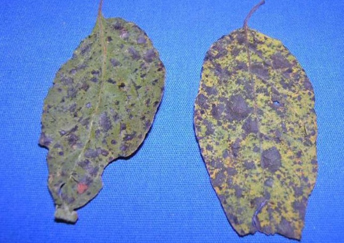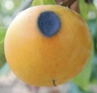 Circular , sunken lesions on leaves and fruits , which may enlarge and turn black or brown and the lesions may also ooze a gummy substances , small , round , water-soaked spots on leaves , the spots may enlarge and turn brown or black.