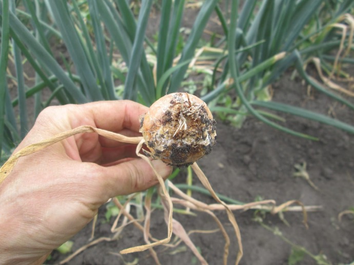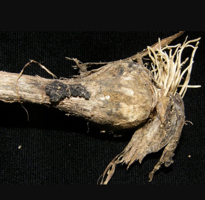 Brown , mushy spots on the bulbs , grey mould on affected areas, yellowing and wilting of leaves , starting from the bottom of the plant, stunted growth, rotting of the base of the stem and roots.