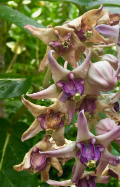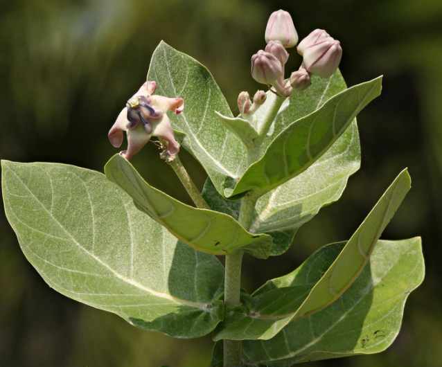 Giant Milkweed (Calotropis gigantea) grows up to 10 ft, prefers sandy soil, full sun, low moisture, and is medicinal but not edible.