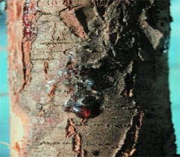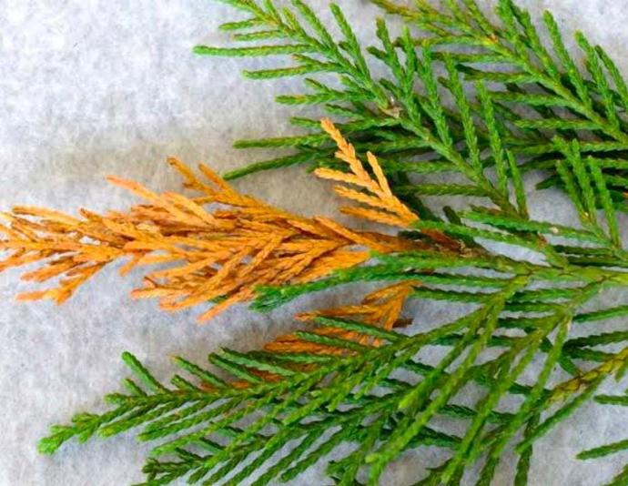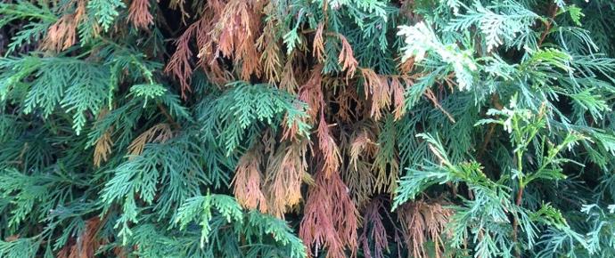 The most noticeable symptom of Seridium canker is yellowing or browning of the foliage on one or more top or lateral branches
