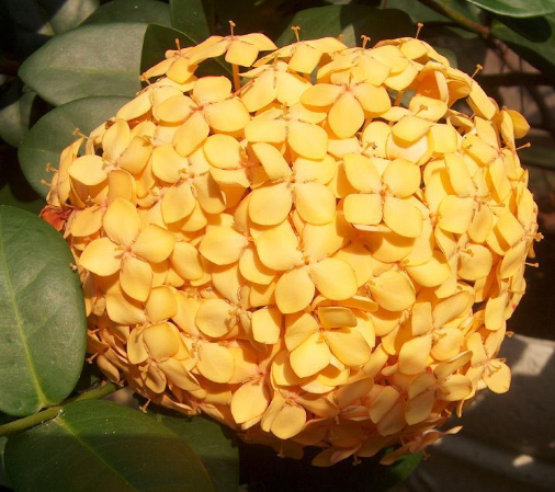Golden Flame (Ixora 'Golden Flame'), a tropical evergreen hybrid shrub, grows 1.2-1.8 m with moderate growth in well-drained acidic soil, thrives in full sun with moderate to high moisture, is non-edible with no medicinal benefits, and produces golden-yellow flower clusters year-round.
