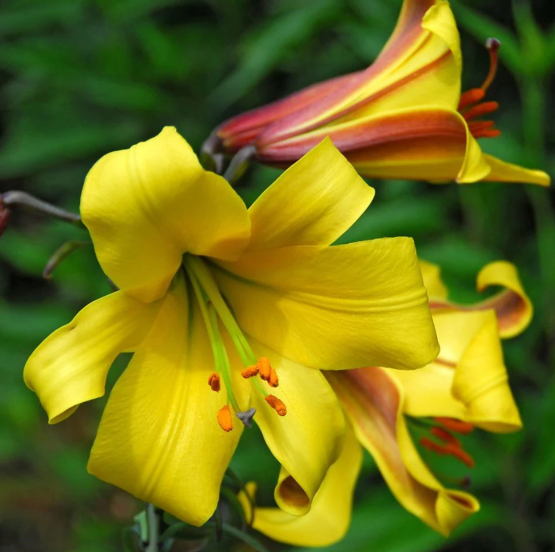 Golden Splendor (Lilium 'Golden Splendor'), a moderately growing trumpet lily hybrid, reaches 1.2-1.8 m in fertile, well-drained soil under full sun, producing 12-20 fragrant golden-yellow flowers with burgundy markings in mid-summer with no edible or medicinal value.