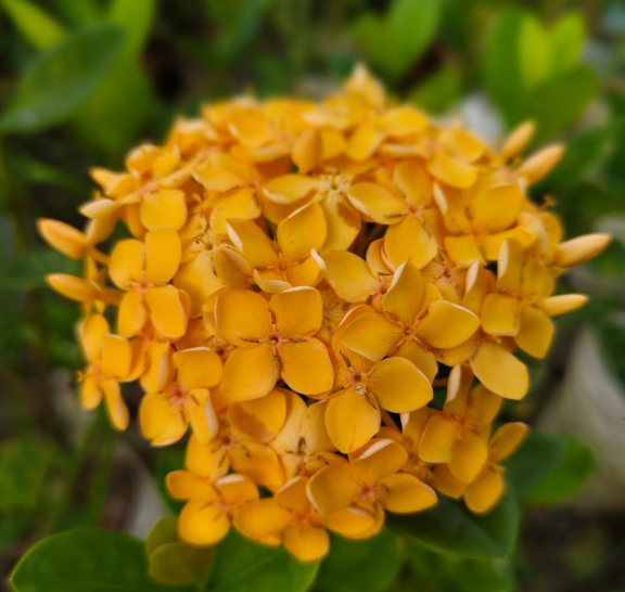 Golden Sun (Ixora 'Golden Sun'), a tropical evergreen hybrid shrub, grows 1.2-1.8 m with moderate growth in well-drained acidic soil, thrives in full sun with moderate to high moisture, is non-edible with no medicinal benefits, and produces golden-yellow flower clusters year-round.