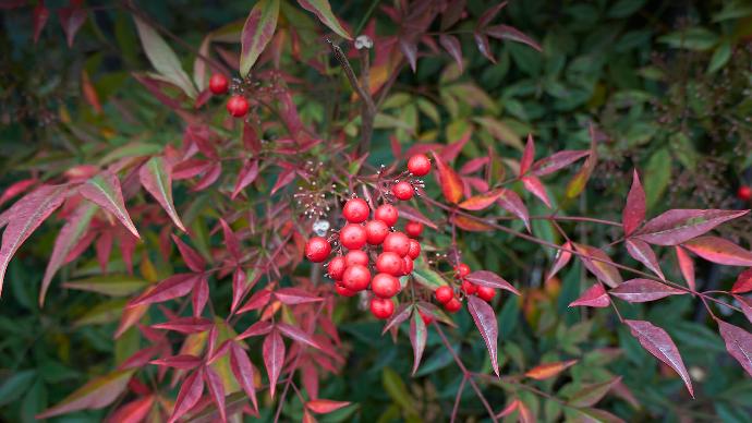 Heavenly Bamboo (Nandina domestica) is a shrub that grows 4-8 ft tall, hardy in USDA Zones 6-9, prefers well-drained, loamy soil, full sun to part shade, low to medium moisture, not edible, and not medicinal.