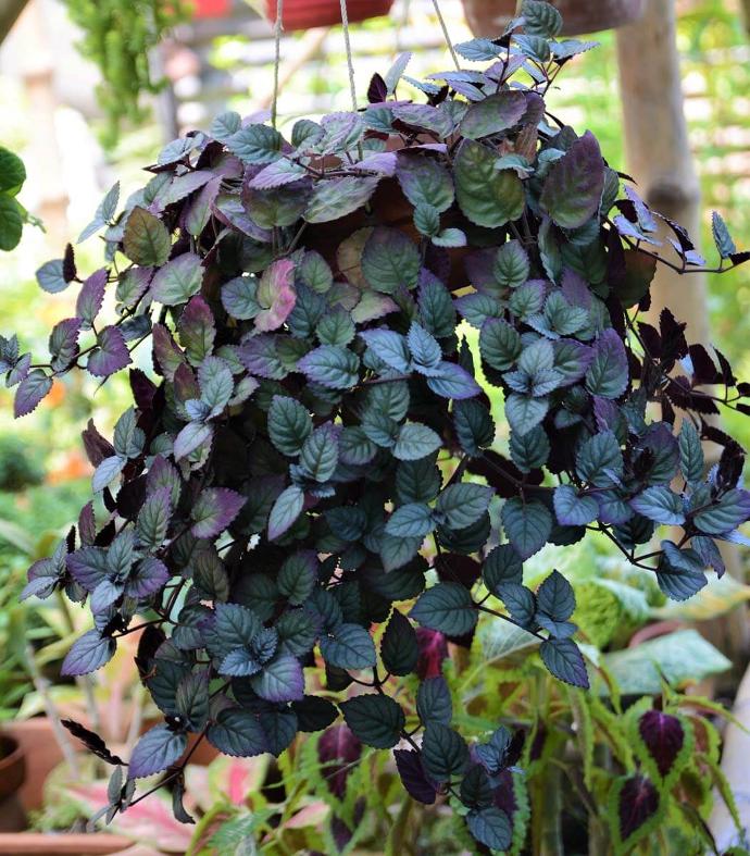 HEMIGRAPHIS ALTERNATA HANGING, also known as Waffle Plant, is an indoor trailing plant. Plant in well-draining soil and provide bright, indirect light. Allow the soil to partially dry between waterings. Pruning helps control its growth and maintain a tidy appearance.