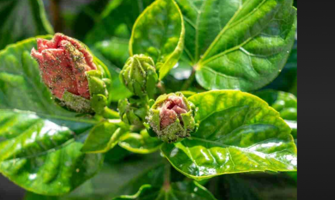Yellowing leaves, distorted growth, powdery substance on leaves