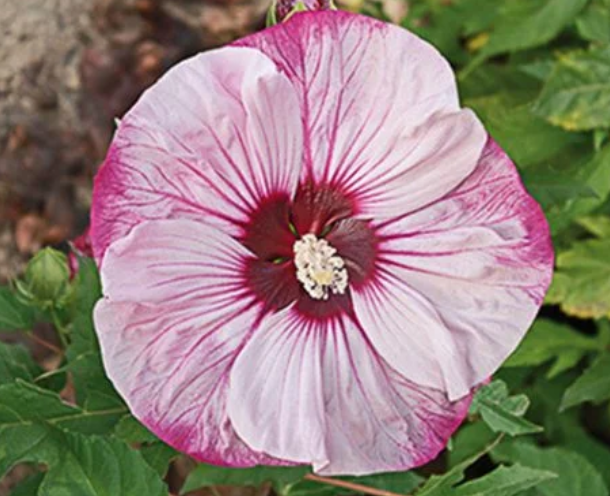 Hibiscus 'Cherry Cheesecake', a moderately growing hardy hibiscus hybrid, reaches 1-1.2 m in moist, fertile soil under full sun, producing 30-60 white flowers with cherry-red veins from mid-summer to fall with no edible or medicinal value.