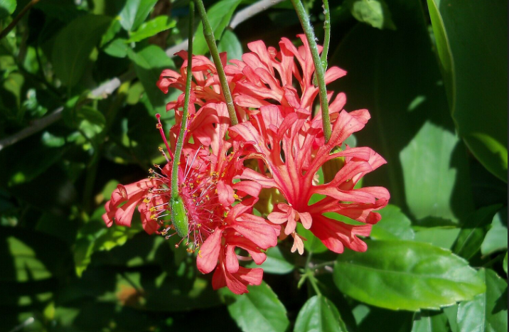 Hibiscus schizopetalus, a moderately growing evergreen shrub from East Africa, reaches 1-3 m in loamy soil under full sun to part shade, producing 30-70 fringed red flowers year-round with no edible or medicinal value.