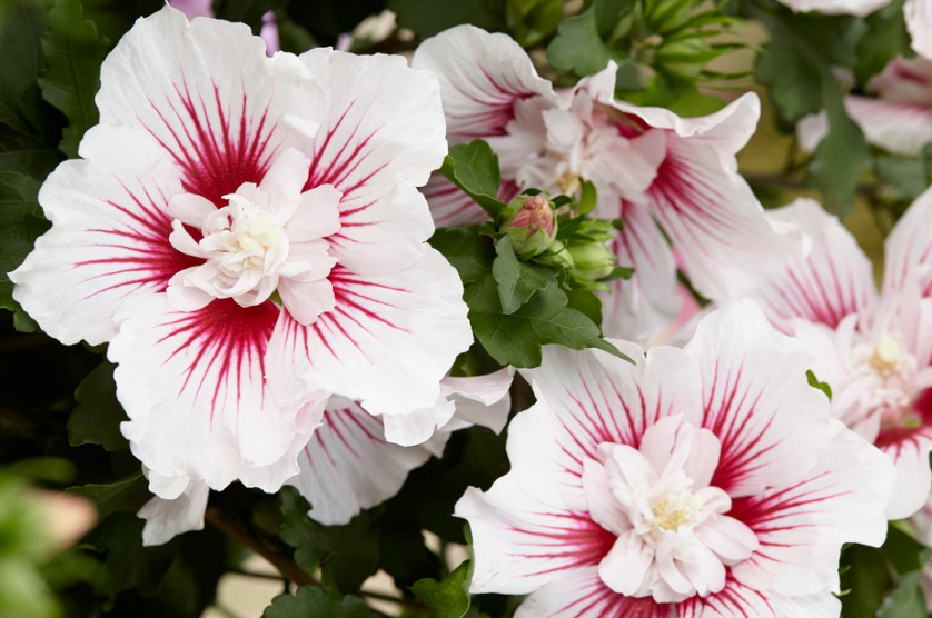 Hibiscus syriacus, a moderately growing deciduous shrub from Asia, grows 2-4 m in fertile soil under full sun, yielding 30-80 flowers from summer to fall with edible flowers used for skin-soothing and antioxidant benefits.