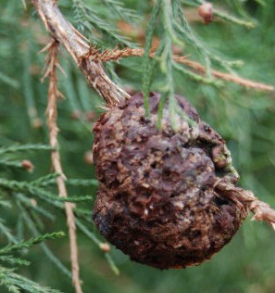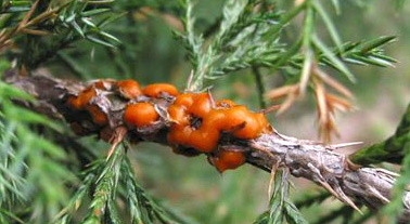 Yellowing, wilting leaves, Orange, gelatinous galls on branches, Curling, stunted growth, White powdery spots on leaves.