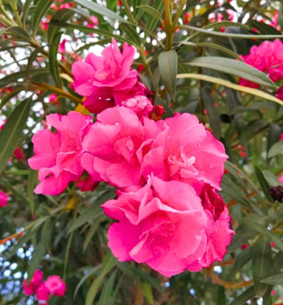 Double Blush (Nerium oleander 'Double Blush'), a hypothetical Mediterranean evergreen shrub, grows 1.8-2.4 m with vigorous growth in well-drained sandy-loam, thrives in full sun with low to moderate moisture, is non-edible and toxic with no medicinal benefits, and produces double soft pink (blush) flowers in summer.