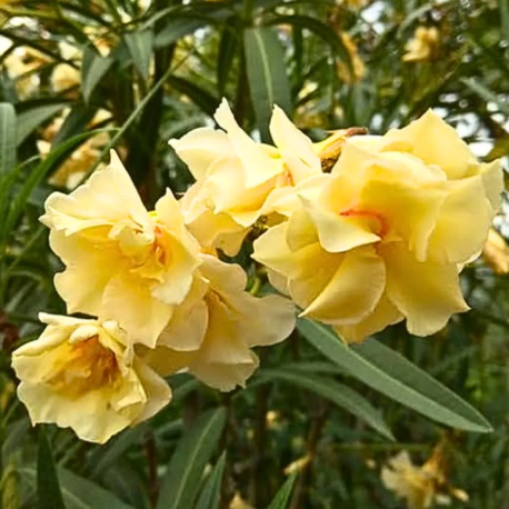 Double Cream (Nerium oleander 'Double Cream'), a hypothetical Mediterranean evergreen shrub, grows 1.8-2.4 m with vigorous growth in well-drained sandy-loam, thrives in full sun with low to moderate moisture, is non-edible and toxic with no medicinal benefits, and produces double cream-colored flowers in summer.