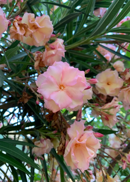 Double Peach (Nerium oleander 'Double Peach'), a hypothetical Mediterranean evergreen shrub, grows 1.5-2 m with moderate growth in well-drained sandy-loam, thrives in full sun with low to moderate moisture, is non-edible and toxic with no medicinal benefits, and produces double peach-colored flowers in summer.