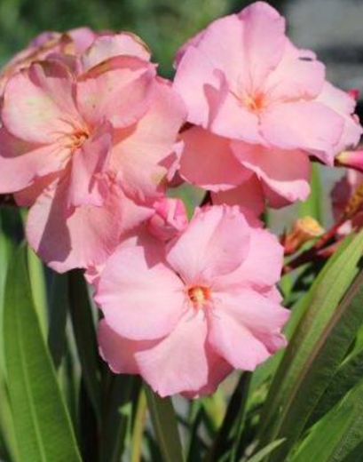 Double Pink (Nerium oleander 'Mrs. Roeding'), a Mediterranean evergreen shrub, grows 1.5-2 m with moderate growth in well-drained sandy-loam, thrives in full sun with low to moderate moisture, is non-edible and toxic with no medicinal benefits, and produces fragrant double salmon-pink flowers in summer.,