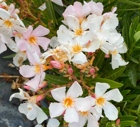 Single Cream (Nerium oleander 'Sealy Cream'), a Mediterranean evergreen shrub, grows 1.8-2.4 m with vigorous growth in well-drained sandy-loam, thrives in full sun with low to moderate moisture, is non-edible and toxic with no medicinal benefits, and produces single cream-colored flowers in summer.