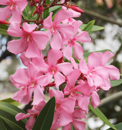 Single Pink (Nerium oleander 'Sealy Pink'), a Mediterranean evergreen shrub, grows 1.8-2.4 m with vigorous growth in well-drained sandy-loam, thrives in full sun with low to moderate moisture, is non-edible and toxic with no medicinal benefits, and produces early-blooming single pastel pink flowers with coral streaks in summer.,