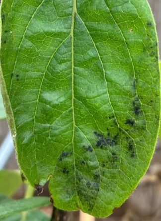 Dark lesions on fruit and leaves, White powdery spots on leaves, Yellowing, wilting leaves, Curling, Small holes in fruit.