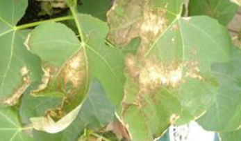Brown or black spots on leaves, White powdery spots on leaves, Yellow mottling on leaves, stunted growth.