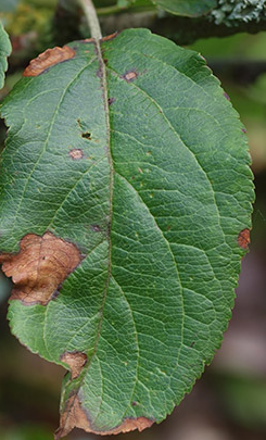 Dark lesions on leaves and fruit, White powdery spots on leaves, Yellowing, wilting leaves, Curling, Small holes in fruit.