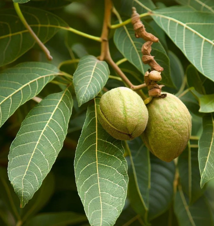 Carya illinoinensis, or Indian Wild Pecan, is a slow-growing tree reaching 10-20m, prefers well-drained loamy soil, full sun, and produces edible nuts.