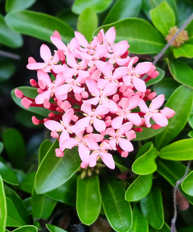 Ixora javanica, a tropical evergreen shrub native to Java, Indonesia, grows 2-3 m with moderate growth in well-drained acidic soil, thrives in full sun to partial shade with moderate to high moisture, is non-edible with no medicinal benefits, and produces red-orange flower clusters year-round.