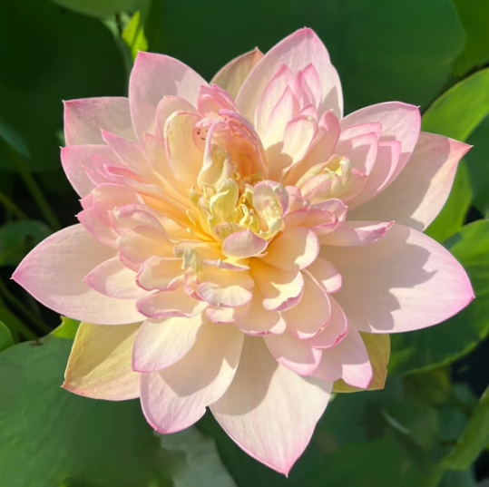 A versicolor lotus with creamy yellow centers fading to pink tips, forming a peach tone, ideal for small ponds with edible parts and stunning aesthetics.