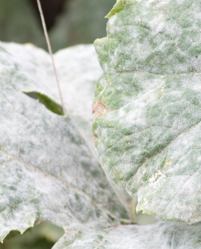 White powdery substances on leaves, young shoots and flowers . yellowing, wilting and decline of the entire plant.