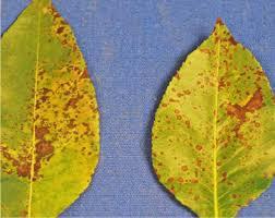 Dropping of leaves and branches , colour fade to yellow to brown . Fairly defined margins and brown black tan or reddish centres .