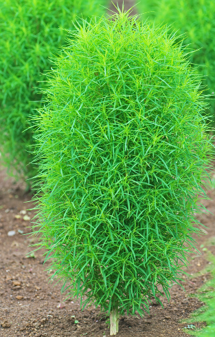Kochia (Bassia scoparia) grows up to 5 ft, prefers well-drained soil, full sun, low moisture, and is medicinal but not edible.