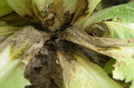 Wilting seedlings, white or gray fuzzy growth on soil, small water-soaked spots turning dark on leaves