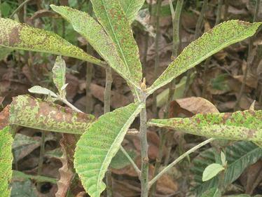 Wilting and blackening of leaves, cankers on branches White powdery spots on leaves Dark sunken spots on leaves and fruit Brown mushy spots on fruit Brown spots on leaves