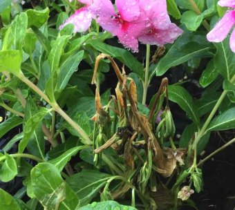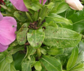 Powdery white coating, brown or black leaf spots, leaf drop, wilting