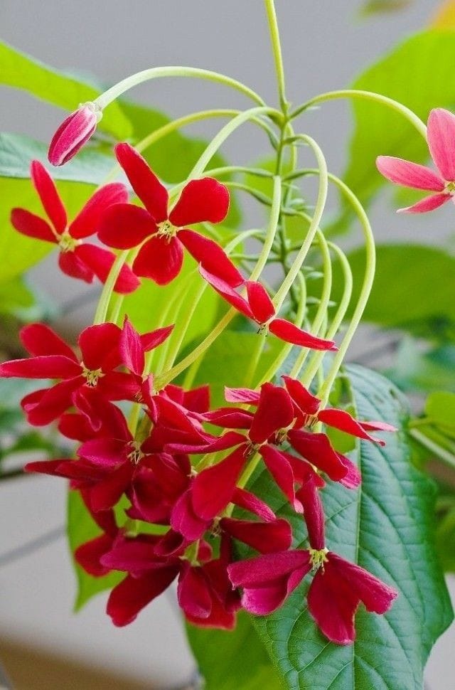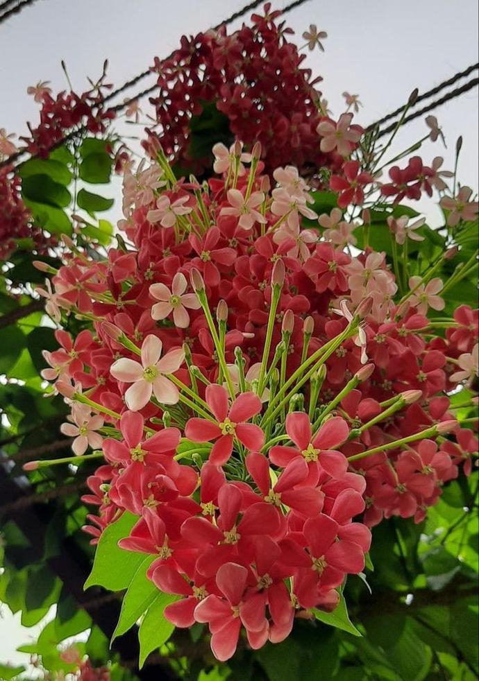 Madhumalti flowers are usually white at first, gradually turning pink and then deep red as they mature, and this colour change is characteristic of the plant. enhances its decorative appeal.