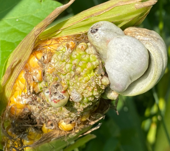 Swollen, grayish-white galls on kernels and leaves, Yellow streaks on leaves, Long gray-green lesions on leaves, Orange pustules on leaves, Moldy growth on kernels.