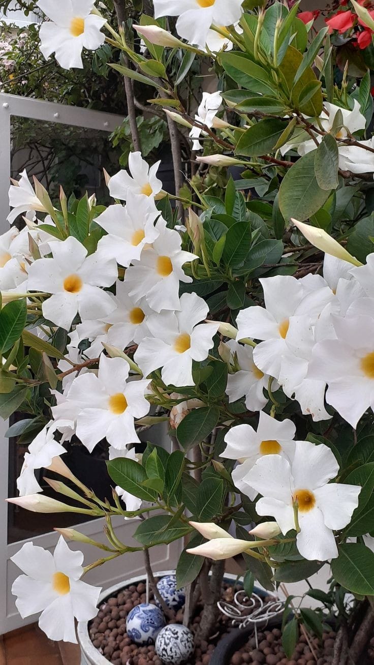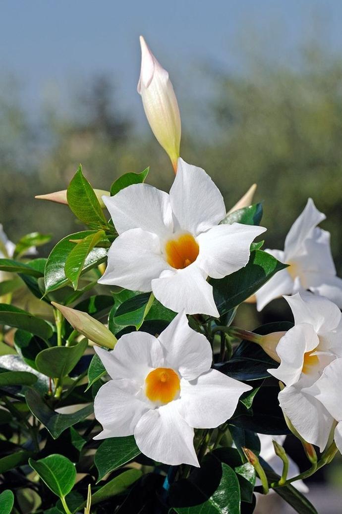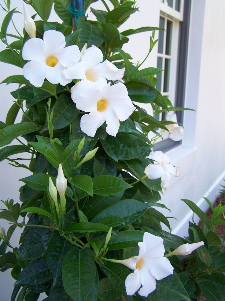 Also known as white dipladenia, this variety is characterized by white star-shaped flowers with yellow throats.