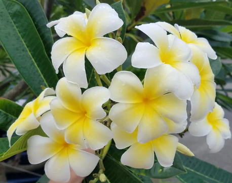 Mele Pa Bowman (Plumeria rubra x obtusa 'Mele Pa Bowman'), an evergreen tropical shrub/tree, grows 1.8-6 m with moderate growth in well-drained sandy soil, thrives in full sun with moderate moisture, is non-edible with no medicinal benefits, and produces yellow and white flowers with a strong perfume fragrance in summer-fall.
