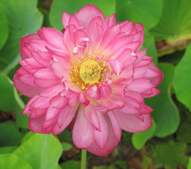 A dwarf lotus with rose-pink, double blooms, ideal for small ponds or containers, offering edible parts and ornamental beauty in sunny conditions.