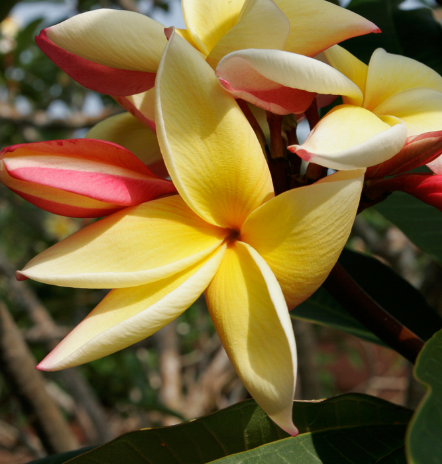 Moragne #23 (Plumeria rubra 'Moragne #23'), a deciduous tropical shrub/tree, grows 3-6 m with moderate growth in well-drained sandy soil, thrives in full sun with moderate moisture, is non-edible with no medicinal benefits, and produces large pink and yellow flowers with a sweet fragrance in summer-fall.