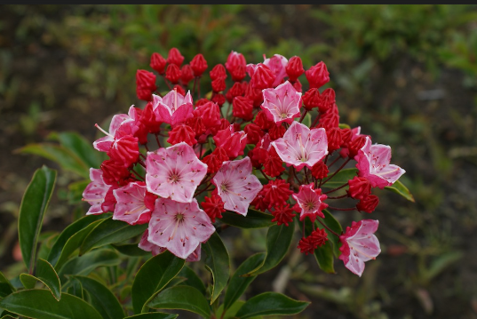 Mountain Laurel (Kalmia latifolia) is a shrub that grows 5-15 ft tall, hardy in USDA Zones 5-9, prefers moist, well-drained soil, part shade to full shade, medium to high moisture, not edible, and has medicinal uses.