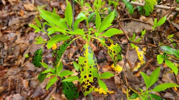Dark spots on leaves ,White, powdery growth on leaves ,Orange or yellow spots on leaves, Distorted leaves, sticky residue, Sticky residue, sooty mold