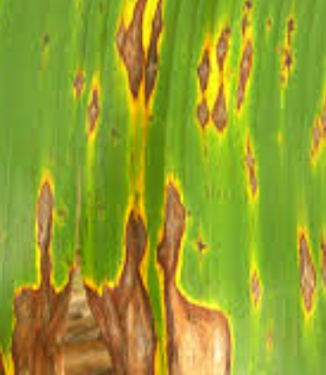 yellowing and wilting of older leaves, leaf splitting, brown vascular discoloration in pseudostem, soft or foul-smelling rhizomes, brown or black leaf spots, stunted growth, sticky honeydew and fine webbing
