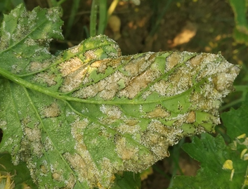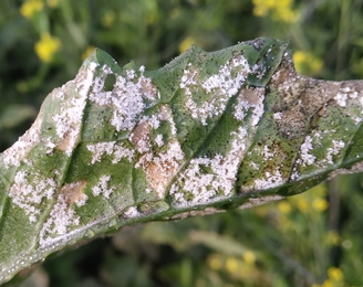 Wilting seedlings, white or gray fuzzy growth on soil, small water-soaked spots turning dark on leaves