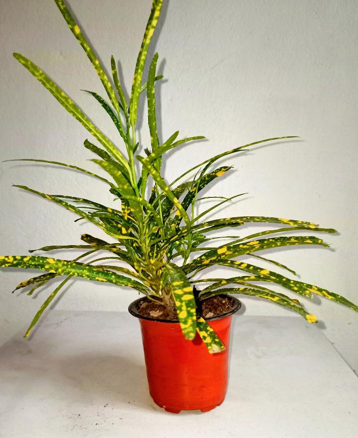 Proper hydration of narrow-leafed crotons involves keeping the soil evenly moist but not soggy. Water when the soil surface is dry to ensure good drainage to prevent root rot. These plants prefer slightly higher humidity, so mist the leaves from time to time to increase humidity. Please be careful not to overwater as this may cause root rot.