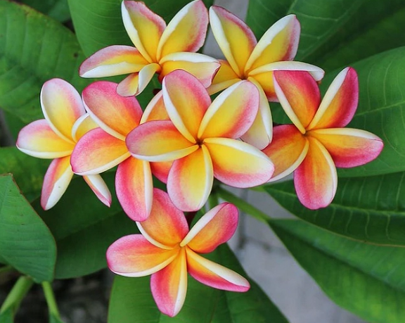 Nebel's Rainbow (Plumeria rubra 'Nebel's Rainbow'), a deciduous tropical shrub/tree, grows 3-6 m with moderate growth in well-drained sandy soil, thrives in full sun with moderate moisture, is non-edible with no medicinal benefits, and produces rainbow-colored (pink, yellow, white, red) flowers with a sweet fragrance in summer-fall.