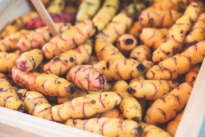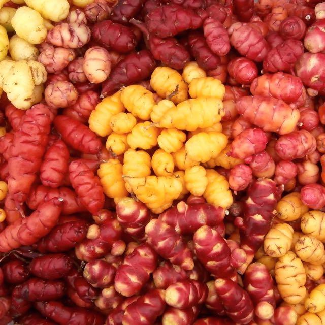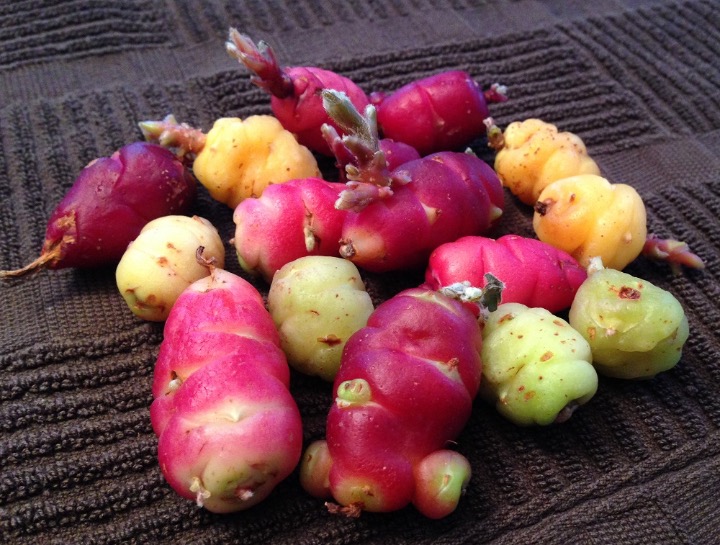 This is a traditional oka variety with tubers that range in color from yellow to red to pink.
