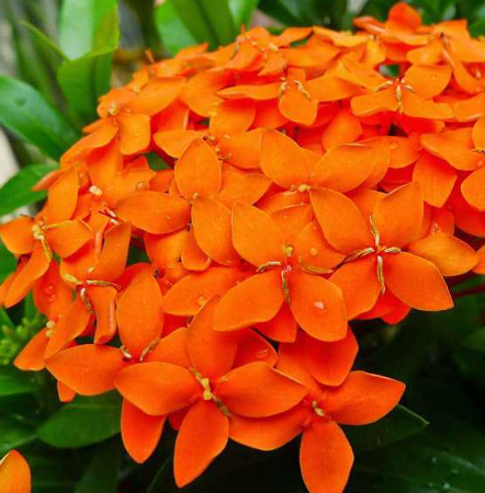 Orange Delight (Ixora 'Orange Delight'), a tropical evergreen hybrid shrub, grows 1.2-1.8 m with moderate growth in well-drained acidic soil, thrives in full sun with moderate to high moisture, is non-edible with no medicinal benefits, and produces bright orange flower clusters year-round.