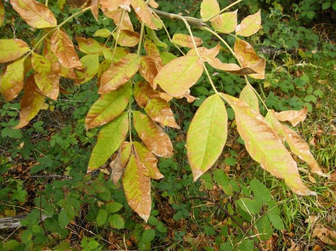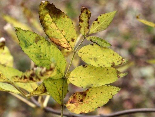 Blackened, wilting leaves and dieback of shoots and branches; lesions on the bark.